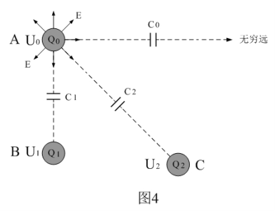 設(shè):物體B和物體C沒受帶電物體A感應(yīng)之前,所帶電荷以及對(duì)地電位均為零,則:電荷Q1和Q2,電壓U1和U2都是由于帶電物體A對(duì)物體B和物體C感應(yīng)產(chǎn)生的電荷和電壓;U0越高,感應(yīng)產(chǎn)生的U1和U2對(duì)地電位就越高,以及電荷Q1和Q2就越多,由此可求得: