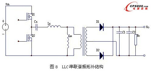 圖8為LLC串聯諧振的拓撲結構。從圖中可以看出,兩個主開關Ql和Q2構成一個半橋結構,其驅動信號是固定50%占空比的互補信號,電感Ls、電容Cs和變壓器的勵磁電感Lm構成一個LLC諧振網絡。在LLC串聯諧振變換器中,由于勵磁電感Lm串聯在諧振回路中,開關頻率可以低于LC的本征諧振頻率fs,而只需高于LLC的本征諧振頻率fm便可實現主開關的零電壓開通。所以,LLC串聯諧振可以降低主開關管上的EMI,把電磁輻射干擾(EMI)減至最少。在LLC諧振拓撲中,只要諧振電流還沒有下降到零,頻率對輸出電壓的調節趨勢就沒有變,即隨著頻率的下降輸出電壓將繼續上升,同時由于諧振電流的存在,半橋上下兩個主開關的零電壓開通條件就得以保證。因此,LLC諧振變換器的工作頻率有一個下限,即Cs與Ls和Lm的串聯諧振頻率fm。在工作頻率范圍fm<f<fs內,原邊的主開關均工作在零電壓開通的條件下,并且不依賴于負載電流的大小。同時,副邊的整流二極管工作在斷續或臨界斷續狀態下,整流二極管可以零電流條件下關斷,其反向恢復的問題得以解決,不再有電壓尖峰產生。