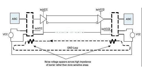 如圖4所示,通過相對于其他電路組件而言的高阻抗,隔離中斷了由電路通路形成的環(huán)路。通過中斷該環(huán)路,噪聲電壓出現(xiàn)在隔離層上,而非出現(xiàn)在接收機或更為敏感的組件上。噪聲電壓的高電平可以由外部電流或電壓源(例如:電感馬達和閃電(lightning))耦合。[page]