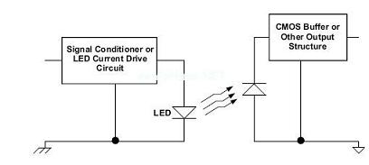 光耦合技術(shù)是在透明絕緣隔離層(例如:空氣間隙)上的光傳輸,以達到隔離目的。圖5顯示了一款數(shù)字隔離器的主要組件。該電流驅(qū)動器采用數(shù)字輸入,并將信號轉(zhuǎn)換為電流來驅(qū)動發(fā)光二極管(LED)。輸出緩沖器將光電探測器的電流輸出轉(zhuǎn)換為一個數(shù)字輸出。