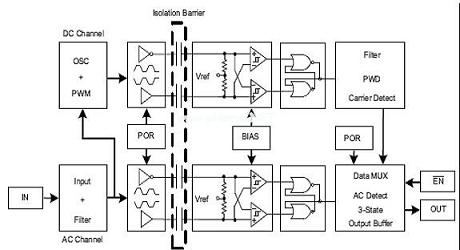 為了提供恒定信息的傳輸,ISO72x使用一個高信號速率和低信號速率通道來進行通信,如圖9所示。高信號速率通道未被編碼,并且其在一個單端到差分轉(zhuǎn)換之后的隔離層上傳輸數(shù)據(jù)。該低信號速率通道以一種脈寬調(diào)制格式對數(shù)據(jù)進行編碼,并在隔離層上差分傳輸數(shù)據(jù),從而確保了恒定狀態(tài)的精確通信(1和0的長字符)。