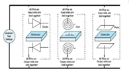 三個主要標準驗證了對于隔離保護的必要性,其分別為UL1577、IEC60747-5-2和CSA。雖然每一種標準都稍有不同,但是均提供了一個對比隔離性能的標準。IEC、UL和CSA的測試證實了輸入和輸出之間電介質(zhì)擊穿以外的電壓。運用這些標準非常簡單,因為測試標準和隔離方法無關(guān)。圖10顯示了隔離測試是如何將隔離器看作是兩端器件的。盡管每種器件的物理結(jié)構(gòu)存在差異,但隔離測試卻是在電介質(zhì)擊穿電壓上測定的。