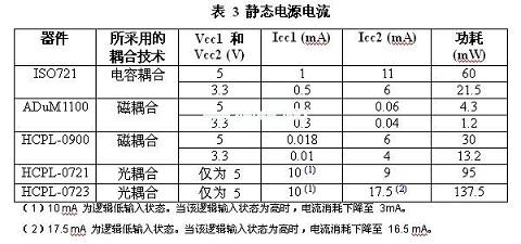除了隔離層上信號傳輸?shù)男手猓斎牒洼敵稣{(diào)節(jié)電路的設(shè)計同功耗的相關(guān)性最大。如表3所示,與電感或電容實例相比,光耦合器的功耗會更高。