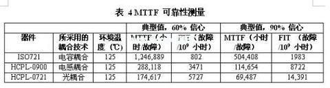 故障前平均工作時間(MTTF)是半導體設(shè)備可靠性的標準測量方法。對于數(shù)字隔離器而言,這種測量表示集成電路和隔離機制的可靠性。表4顯示了一款光、電感和電容數(shù)字隔離器的MTTF。與電感及光解決方案相比,ISO721非常可靠。