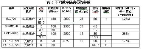 噪聲降低和噪聲保護使得隔離器在那些隔離器中斷接地環(huán)路并將接地電壓差隔離的電子電路中得到廣泛使用。設(shè)計人員現(xiàn)在擁有許多用來進行數(shù)字信號隔離的選擇,包括TI推出的ISO72x系列,其在信號速率、電介質(zhì)擊穿電壓、瞬態(tài)抗擾度、功耗、磁場抗擾度以及可靠性等重要特性方面均表現(xiàn)不俗。表6對本報告中所討論實例的這些特性進行了總結(jié)。