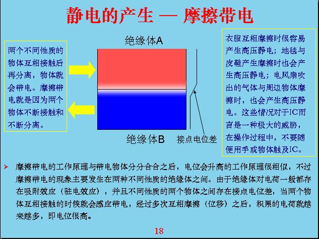 舉一個具體的例子,比如說我現(xiàn)在這個人站在地上,我是光著腳,地板是導(dǎo)電的,這個椅子是絕緣的,我從地面一站到椅子上就相當(dāng)于我?guī)щ娏恕槭裁矗恳驗槲以瓉硎菢O化帶電,上面帶負電,下面帶正電,我站在地上下面就變成零,上面變成了-100v,站上去的時候相對來說我就變成帶電的人。所以,很多在半導(dǎo)體車間或者和集成電路接觸、打交道的人,不要隨隨便便用人摸集成電路,因為你這個人不知不覺就帶電了,你從門外面走進房子里很可能就帶電了,在上樓梯或者地板鋪有一層絕緣的東西,在絕緣以外的時候你不帶電,站上去就帶電了,因為上面有電層。還有空調(diào)的風(fēng)吹出來的空氣會和你身體上面的衣服進行摩擦、感應(yīng),它容易帶電,用靜電筆來測,隨便碰衣服或頭發(fā),上面帶的電基本上都有300v左右,如果摩擦幾下大概就有4000-5000v,所以靜電感應(yīng)是相當(dāng)厲害的,很多模型電路在送到工廠的時候就是用盒子包裝,因為盒子是導(dǎo)電的,如果用電表去量它好像沒有電阻,電阻是無窮大,其實它是導(dǎo)電的,相對來說電導(dǎo)率很低,也就是電阻很大。