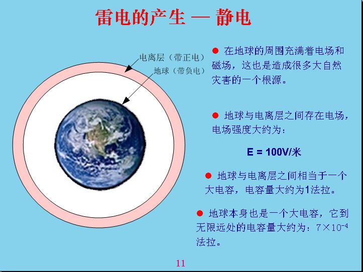 為什么會產(chǎn)生雷電?可能大部分人都不知道,我在這里就給大家講解一下雷電是怎么產(chǎn)生的。雷電是由于電磁場產(chǎn)生的,世界上什么電都是通過電磁場反應(yīng)產(chǎn)生的。為什么會產(chǎn)生雷電呢?因為在離地球30公里外有一個電離層,電離層實際上就是最外的空氣受到太陽光、紫外線照射而產(chǎn)生電離,太陽光實際上也是一種電磁波,電磁波的作用相當(dāng)于我們把一個食物放在微波爐里面加熱,原理是差不多的,但是微波的波長線很長,紫外線相當(dāng)短,所以作用不一樣,用微波爐不能把空氣進行電離,只有紫外線能夠電離。被電離以后會分成兩層,一層帶正電,一層帶負電,與地球相對的一層帶正電,地球就是帶負電。地球是一個圓的,帶電的話相當(dāng)于電層強度是散發(fā)性的,越靠近地球電容強度越高,靠近地球表面是100v,也就是說一米高的位置電容強度是100v電容強度就是用這個來表示,大家在中學(xué)里面很少用電位梯度的概念表達電容強度,后面我們在工作中還是用電位梯度來表示電容強度是最合適的,比如靈敏度、多少毫伏米都是屬于電感強度。以前是用牛頓的力學(xué)來表達,那個概念相對來說比較難理解,兩個帶電物體之間產(chǎn)生多少牛頓力的時候,換算成單位來表示電容強度,這個強度不太好理解,如果用電位梯度表示就很方便了。