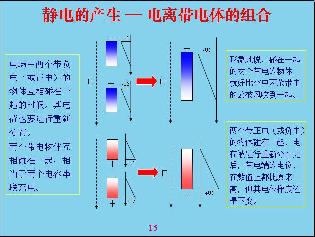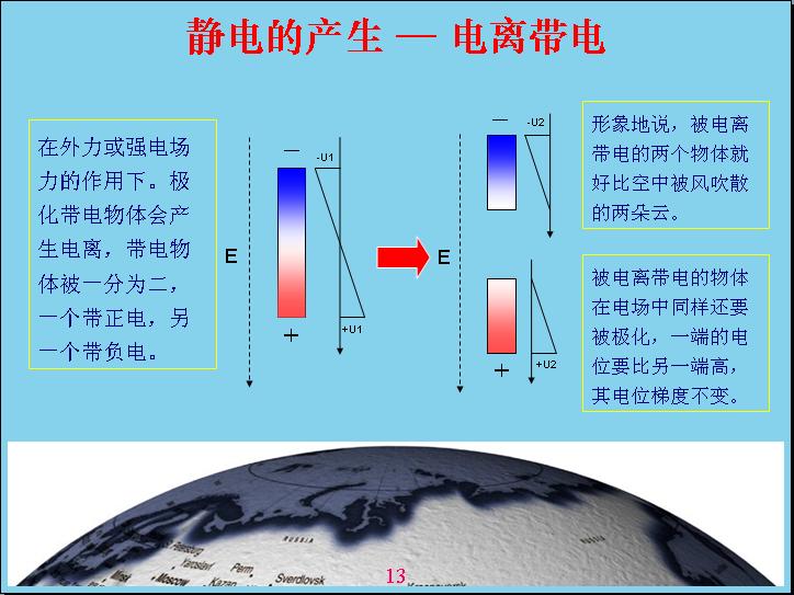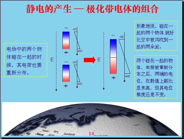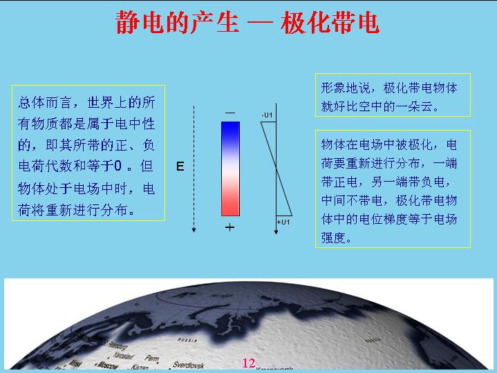 由于地球是帶電的,相對電容層來說。一個物體在地球空間里面就會受到電場的作用產(chǎn)生極化,什么叫極化?就是說一個物體原來是不帶電的,現(xiàn)在產(chǎn)生極化帶電,一端帶正電,一端帶負電。比如說這個源相當(dāng)于一個導(dǎo)體,如果底下是絕緣的話,上面如果沒有屏蔽,我的上面就帶負電,下面帶正電,中間這個地方是不帶電的,人相對來說還是偏中性,但是雖然極化帶電的,但我總得來說還是變中性,帶的正電和負電都是相等的。如果把原來極化帶電的物體分成兩個,這兩個都會帶電。形象地說,一朵云在電場作用下極化帶電,但沒有產(chǎn)品電流,電感強度沒有達到這么高,如果把它分成兩塊就會產(chǎn)生電容帶電。現(xiàn)在由于風(fēng)的作用,把它一吹變成兩塊,中間的地方分成兩塊,有一塊相當(dāng)于帶負電,有一塊帶正電。這就表示電位曲線,中間這個地方表示電位反映,上面帶負電,下面帶正電,這個幅度越高表示帶電幅度也越高。這個沒有帶正電,那個沒有帶負電,電容性就破壞了,相對來說是帶負電,這個帶正電的。云帶電就是因為這樣產(chǎn)生的。