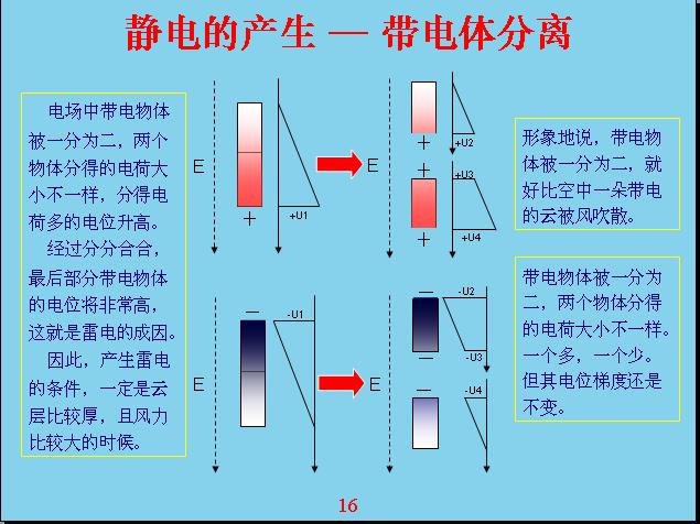 如果一個帶電體之間分開的話,就有一個大的電位,絕對值相對來說也會偏高,這就是因為云受到極化帶電以后,分分離離又合合,使得云帶的電越來越高。帶電越來越高以后能量也越來越高,兩個碰在一起就會放電,就會產(chǎn)生雷電,雷電就是這樣產(chǎn)生的。雷電就是因為在地球的外圍空間里面存在電場,云又受到風(fēng)的作用,才會互相分離又互相組合,使帶電物體的電位越來越高,最后形成放電。 還有摩擦帶電也是由于電場產(chǎn)生的,因為兩種不同的物體有接點電位差,電磁也是靠兩種不同物體產(chǎn)生的電位差,最后產(chǎn)生化學(xué)作用,之前電場沒有發(fā)生化學(xué)作用的時候,兩個物體靠在一起就會產(chǎn)生電場作用,就已經(jīng)有了電位差,產(chǎn)生摩擦的話和雷電產(chǎn)生的過程一樣,來回分離又組合,最后產(chǎn)生一個高的電場。