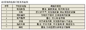 造成電源干擾復雜性的第二個原因是干擾表現(xiàn)的形式很多,從持續(xù)期很短的尖峰干擾直至電網(wǎng)完全失電,其中也包括了電壓的變化(如電壓跌落、浪涌和中斷)、頻率變化、波形失真(包括電壓和電流的)、持續(xù)噪聲或雜波,以及瞬變等。我們根據(jù)國內(nèi)外的抗擾度測試的一系列標準和實際應用中常常出現(xiàn)的問題,總結了電源干擾的常見起因,如表1所示。