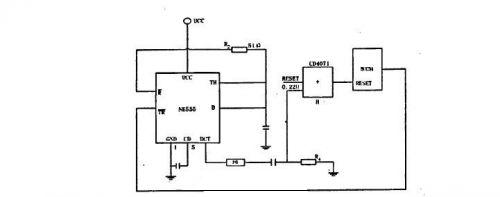 采用單穩(wěn)態(tài)觸發(fā)器NE555作為微機看門狗電路;當(dāng)系統(tǒng)工作正常時,看門狗電路不起作用,當(dāng)系統(tǒng)運行不正常時,80C51的P1.1引腳不能給定時器送去觸發(fā)脈沖,這時NE555中單穩(wěn)態(tài)觸發(fā)器就輸出脈寬大于4US負(fù)脈沖,經(jīng)F6反相后加至80C51的復(fù)位端,使系統(tǒng)可靠的復(fù)位,這樣可防止因外界干擾引起的程序跑飛,使微機程序正常運行,見圖1。