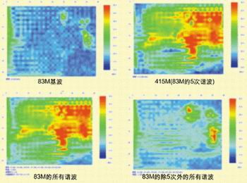 圖3的各個空間分布圖,是通過指定頻率點來看該頻率點的空間腹部圖。通過在圖中最上面的頻譜圖中用×指定頻率點后得到的。可以指定一個頻率點查看每個頻率點的空間分布,也可以指定多個頻率點,例如指定83M的所有諧波點,查看總的頻譜圖。