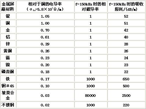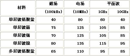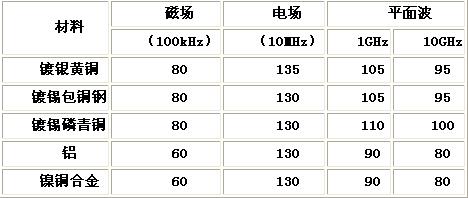 電子設備采用金屬平板做機箱,既堅固耐用,又具有電磁屏蔽作用。其電磁屏蔽效能與金屬平板材料性質、電磁場源性質、電磁場源與金屬平板的距離、屏蔽體接地狀況等參數有關。各種金屬屏蔽材料的性能見表2。