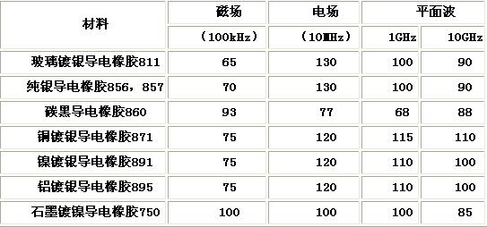 導電顆粒屏蔽材料是將鍍銀的玻璃粒子、純銀粒子、碳黑粒子、銅鍍銀粒子、鎳鍍銀粒子、鋁鍍銀粒子、石墨鍍鎳粒子分別摻在硅或氟硅橡膠,可以擠出各種形狀,用于電磁和水汽密封。它們的屏蔽效能見表11。