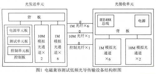 EMC測試低頻光導傳輸設備由光發(fā)送單元和光接收單元組成。光發(fā)送單元由背板、控制板(包括電源單元、測試信號發(fā)生器單元及控制電路單元)、1OMHz通道發(fā)送板(2通道)以及1MHz通道發(fā)送板(6通道)組成;光接收單元由背板(包括電源單元、IEEE488接口單元)、10MHz通道接收板(2通道)以及1MHz通道接收板(6通道)組成。如圖1所示。