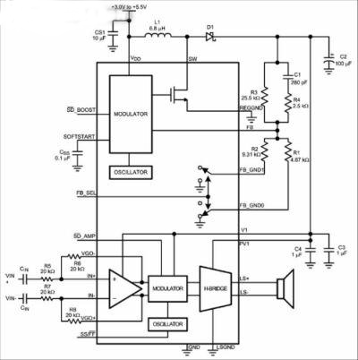 LM48511是一個(gè)擴(kuò)頻調(diào)制式D類音頻放大器,內(nèi)部集成了一個(gè)內(nèi)置式升壓穩(wěn)壓器,可把電壓提升至7V,從而增強(qiáng)放大器的輸出功率和音頻聲壓級(jí)。此外,該升壓穩(wěn)壓器即使在電池衰減的情況下也可使放大器維持一個(gè)固定的輸出水平。