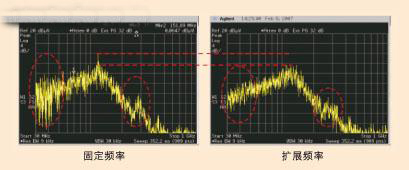從圖中可見,在處理D類固有的周期性方波時(shí),最基本的難題是諧振間隔時(shí)出現(xiàn)的集中能量。為了設(shè)計(jì)一個(gè)“安靜”的低EMI D類放大器,一個(gè)方法是將頻率來回抖動(dòng),或擴(kuò)展開關(guān)的頻譜,降低頻譜內(nèi)所有點(diǎn)上的能量。與傳統(tǒng)的D類放大器相比,擴(kuò)頻調(diào)制方案有幾個(gè)重要的優(yōu)點(diǎn):除了可保持高效效率和低THD+N外,更重要的是大幅削減了輻射噪聲和EMI,如圖6中所示。