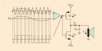 由于自身的效率很高,D類音頻放大器很快就在消費(fèi)電子設(shè)備中獲得了廣泛的應(yīng)用。D類音頻放大器通過輸入的模擬信號(hào)來調(diào)制一個(gè)高頻方波,該方波的頻率可以是固定的也可以是可變的,甚至可以是隨機(jī)脈沖。低通濾波器用來過濾信號(hào)中的高頻內(nèi)容以及恢復(fù)原始音頻信號(hào)。在沒有濾波器的拓樸中,揚(yáng)聲器本身的電感會(huì)被合并成濾波器的一部份。脈沖寬度調(diào)制(PWM)是一種普遍的D類拓樸技術(shù),它采用固定頻率的波形,并通過改變工作周期在低通濾波器后面產(chǎn)生出一個(gè)移動(dòng)平均信號(hào)(圖4)。