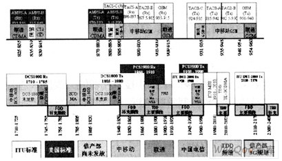 我國現(xiàn)有的無線與移動通信頻譜具體分配情況如圖1所示,此外,WLAN使用無需許可的ISM頻段,UWB使用3.5/5.8G頻段,而WiMAX和RFID尚未最終確定頻段,其 中WiMAX有可能分配在2.5G、3.5G或5.8G頻段。