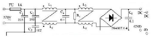 采用無源的EMI濾波器是抑制傳導干擾最有效的辦法。即在電路中插入一個帶通濾波器,讓50 Hz交流電暢通,其余頻率的信號受阻。但要嚴格控制濾波器LC元件的寄生參數,它們的制作工藝、安裝位置、走線方式,都會影響EMI濾波效果。加接圖1所示的濾波電路,可以控制通過傳導耦合進入電網的噪聲電平。