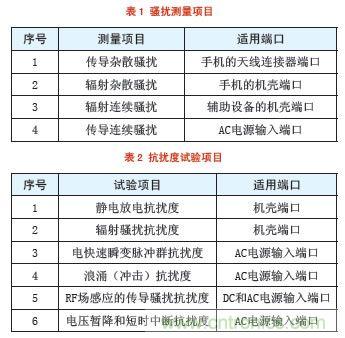 雖然手機的制式不同,但是電磁兼容要測試的項目相同,根據不同的要求來選擇需要測試的項目,電磁兼容測試項目見表1和表2。