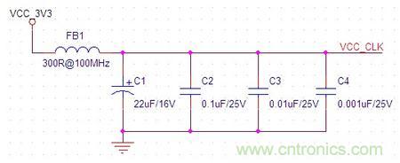 1、時鐘芯片的電源與其它電源用磁珠隔開,磁珠后加去耦電容,去耦電容由22uF的鉭電容和0.1uF、0.01uF、0.001uF的瓷片電容組成,這些電容可分別針對不同頻率的噪聲進行濾波。