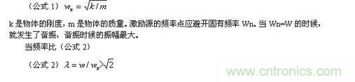 頻率可分為固有頻率Wn和激勵頻率W,固有頻率源于產品的結構特征,由質量、質量分布、質心位置、剛度等多個因素和多個因素間的相互作用所確定。固有頻率計算公式為(公式1)k是物體的剛度,m是物體的質量。激勵源的頻率點應避開固有頻率Wn。當Wn=W的時候,就發生了諧振,諧振時候的振幅最大。