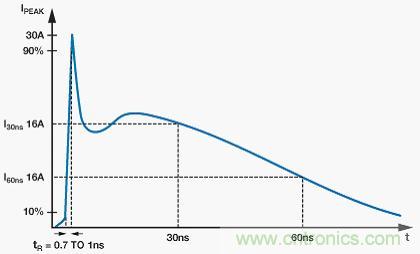 圖1顯示了規范所述的8 kV接觸放電電流波形。一些關鍵波形參數包括小于1 ns的上升時間和大約60 ns的脈沖寬度。這說明脈沖總能量約為數十mJ。