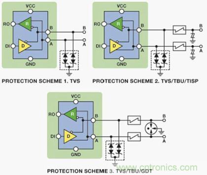 圖6所示電路顯示了三種不同的完整的EMC兼容解決方案。每個解決方案都經過獨立外部EMC兼容性測試公司的認證,各方案使用精選的Bourns外部電路保護元件,針對ADI公司具有增強ESD保護性能的ADM3485E 3.3 V RS-485收發器提供不同的成本/保護級別。所用的Bourns外部電路保護元件包括瞬態電壓抑制器(CDSOT23-SM712)、瞬態閉鎖單元(TBU-CA065-200-WH)、晶閘管電涌保護器(TISP4240M3BJR-S)和氣體放電管(2038-15-SM-RPLF)。