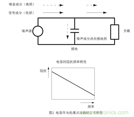 低通濾波器如果要利用該特性,就需要將電容插入噪聲通道與地線之間。如此一來,低頻信號能夠照常通過,高頻噪聲成分因接地側的阻抗較低,將流向接地側,從而達到降噪效果。