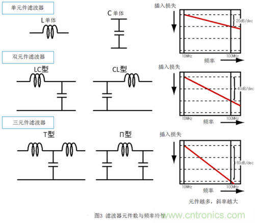 圖 3顯示了組成濾波器的元件數與濾波器頻率特性之間的關系。想知道什么是插入損耗,可以看一下圖中各濾波器的信號衰減量,圖越往下衰減量越多。從圖上我們可 以看到,濾波器中的元件越多,頻率特性的斜率就越大。元件較少的濾波器的頻率特性范圍較窄(斜率較小),衰減頻率及通過頻率的選擇度較低,有可能導致部分 信號衰減或者噪聲沒有徹底去除。另一方面,元件較多的濾波器的頻率特性范圍較寬(斜率較大),頻率的選擇度較高,信號可以在幾乎不衰減的狀態下去除噪聲。