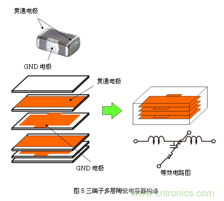 如圖5所示,片狀三端子電容器雖名為三端,但實(shí)為四端結(jié)構(gòu)。這是因?yàn)椋m然四端設(shè)計(jì)可減少接地端電感,但電氣特性方面,無(wú)論哪個(gè)端子都具備相同電位。而引線型三端子電容器原本就為三端結(jié)構(gòu),因此貼片化后仍被稱為"三端"。[page]