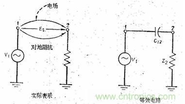 例如兩個導體之間隨時間變化的電場,可用一個電容器來表示,見下圖: