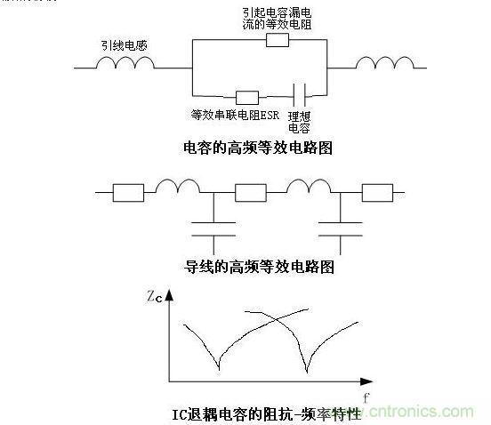 電容,在中低頻或直流情況下,就是一個儲能組件,只表現(xiàn)為一個電容的特性,但在高頻情況下,它就不僅僅是個電容了,它有一個理想電容的特性,有漏電流(在高頻等效電路上表現(xiàn)為R),有引線電感,還在導(dǎo)致電壓脈沖波動情況下發(fā)熱的ESR(等效串聯(lián)電阻),(如圖)。從這個圖上分析,能幫我們設(shè)計師得出很多有益的設(shè)計思路。第一,按照常規(guī)思路,1/2πfc是電容的容抗,應(yīng)該是頻率越高,容抗越小,濾波效果越好,即越高頻的雜波越容易被泄放掉,但事實并非如此,因為引線電感的存在,一支電容僅僅在其1/2πfc=2πf L等式成立的時候,才是整體阻抗最小的時候,濾波效果才最好,頻率高了低了都會濾波效果下降,由此就可以分析出結(jié)論,為什么在IC的VCC端都會加兩支電容,一支電解的,一支瓷片的,并且容值一般相差100倍以上多一點。就是兩支不同的電容的諧振頻率點岔開了一段距離,既利于對稍高頻的濾波,也利于對較低頻的濾波。