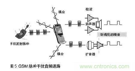 當(dāng)手機(jī)與基站通訊,或兩個(gè)手機(jī)彼此接近時(shí),發(fā)射脈沖通過(guò)擴(kuò)音器,揚(yáng)聲器,或頭戴式耳機(jī)線傳入音頻通路。見(jiàn)圖5,結(jié)果是音頻質(zhì)量大幅降低。