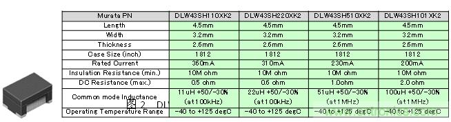 關于CAN中的噪聲對策產(chǎn)品,村田公司已經(jīng)將對應的共模扼流圈DLW43SH系列產(chǎn)品化。該系列產(chǎn)品的外觀以及主要特征如圖2所示。DLW43SH系列是使用在CAN和FlexRay等車載LAN中的噪聲對策用共模扼流圈,是尺寸為4.5×3.2×2.6mm的表面貼裝品。特性值最大為100μH的共模電感,此外,DLW43SH的截止頻率約為1000MHz,可對應高速差分信號對高頻的要求。使用溫度范圍在-40~+125℃,因此適用于車載的廣泛應用。