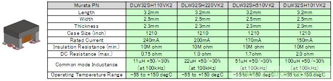 作為DLW43SH系列的小型化產(chǎn)品,DLW32SH系列目前正在開發(fā)中。該系列的外觀以及主要特性如圖3所示。DLW32SH系列的尺寸為3.2×2.5×2.3mm具有小尺寸特點,并且與DLW43SH系列相比,可實現(xiàn)同等性能。其構造的特征是在產(chǎn)品端子部分使用了金屬支架,可以緩和由于溫度變化產(chǎn)生的熱伸縮影響,適用的溫度范圍達到了-55~+150℃。
