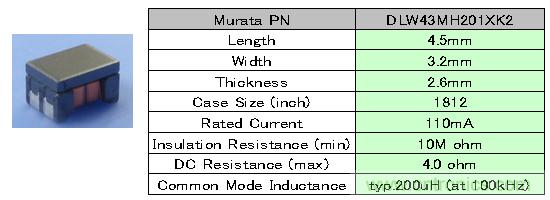 此外,村田公司目前正在開發(fā)作為車載Ethernet用共模扼流圈的DLW43MH系列。該產(chǎn)品的外觀以及主要特性如圖4所示。DLW43MH系列的尺寸和DLW43SH系列同為4.5×3.2×2.6mm,共模電感值提高到了200μH,因此在較寬的頻帶中能起到有效的噪聲對策效果。由于在繞線上下足了功夫并且改善了共模轉差模噪聲,因此噪聲改善效果會更加好。