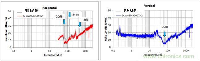 圖6:車載Ethernet中DLW43MH系列的噪聲抑制效果