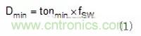試圖在2MHz條件下工作時的第二個考慮因素是最小輸入電壓(VIN)和輸出電壓(VOUT)的轉換比。這與轉換器的最小接通時間有關,因為該比率在轉換器需要操作時設定接通時間。例如,若轉換器具有100ns的最小導通時間且在2MHz條件下工作,則使用公式1,其可以支持的最小轉換比(Dmin)為20%。若給定的VIN至VOUT比所需的導通時間小于最小導通時間,則多數轉換器進入脈沖跨越模式以保持輸出電壓穩定。當脈沖跨越時,開關頻率發生變化且可能在需要限制噪聲的頻率中引起噪聲。