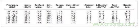 在圖3所示的余量欄中,你可以看到有一個峰值超出了這個規范標準在88.7291MHz處規定的極限,與規范相差-2.3。