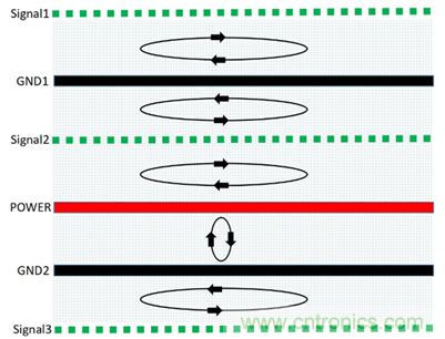 (1)由于信號層與回流參考平面相鄰,S1、S2、S3相鄰地平面,有最佳的磁通抵消效果,優選布線層S2,其次S3、S1。