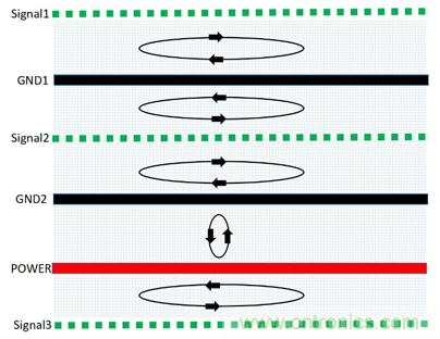 根據麥克斯韋方程,分立的帶電體或電流,它們之間的一切電的及磁的作用都是通過它們之間的中間區域傳遞的,不論中間區域是真空還是實體物質。在PCB中磁通總是在傳輸線中傳播的,如果射頻回流路徑平行靠近其相應的信號路徑,則回流路徑上的磁通與信號路徑上的磁通是方向相反的,這時它們相互疊加,則得到了通量對消的效果。