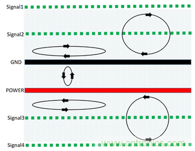PCB疊層EMC規劃與設計思路的核心就是合理規劃信號回流路徑,盡可能減小信號從單板鏡像層的回流面積,使得磁通對消或最小化。