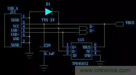 對外接口的信號線同樣需要保護,否則靜電經過信號線直接到達芯片IO管腳,雖然芯片的IO都有二極管保護,一般可以抵御+-2KV的靜電,但是對于+-6KV的ESD接觸放電,就會遭遇損壞的風險。同樣是USB接口,如圖2.1,差分信號線D+和D-接了個ESD器件TPD4S012,實際上是與USB電源和地并接反向二極管,把電流導向USB電源或者地。