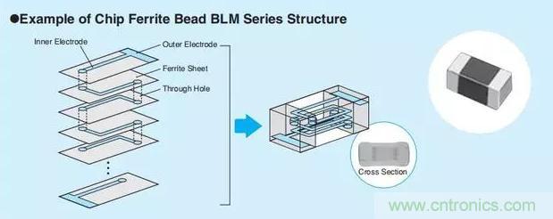 下圖為片狀鐵氧體磁珠的典型結(jié)構(gòu)。在原始鐵氧體片層之間形成線圈圖案,并且通過集成和燒制的過程,產(chǎn)生三維線圈結(jié)構(gòu)。