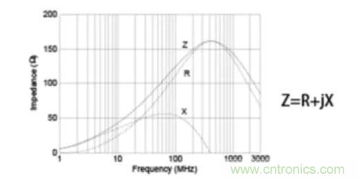 下圖顯示片狀鐵氧體磁珠的阻抗頻率特性的示例。所涉及的基本原理如下:隨著頻率上升,阻抗隨著電感器的增加而成比例增加,因此通過在電路中串聯(lián)連接這些磁珠,它們起到低通濾波器的作用。對于常規(guī)電感器,阻抗(Z)值中的主要特征是電抗分量(X)。