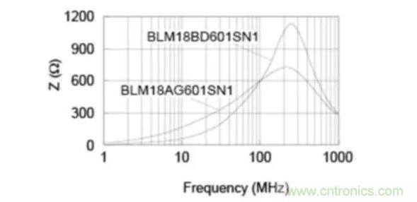 下圖顯示了曲線變化的示例。BLM18AG601SN1和BLM18BD601SN1都是片狀鐵氧體磁珠,在100 MHz時阻抗值為600Ω,但BLM18BD601SN1具有更尖銳的阻抗曲線,而BLM18AG601SN1的曲線上升更為平緩。