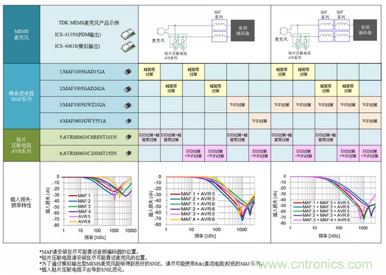 TDK推薦用于抑制麥克風線蜂窩網絡頻帶(700MHz~1GHz、 1.5GHz~2.8GHz)以及WiFi (2.4GHz、3~5GHz) 的TDMA噪音、改善接收靈敏度、抑制ESD的MAF系列與貼片壓敏電阻AVR系列的產品組合示例如下所示(圖9)。