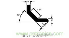 與過(guò)孔相似,直角的轉(zhuǎn)彎路徑應(yīng)該被避免,因?yàn)樗趦?nèi)部的邊緣能產(chǎn)生集中的電場(chǎng)。該場(chǎng)能耦合較強(qiáng)噪聲到相鄰路徑,因此,當(dāng)轉(zhuǎn)動(dòng)路徑時(shí)全部的直角路徑應(yīng)該采用45度。圖5是45度路徑的一般規(guī)則。